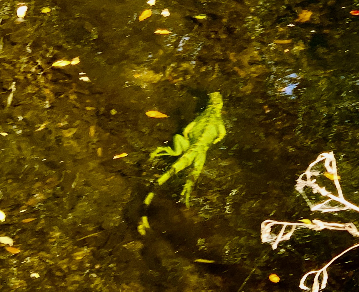 This green iguana is probably a male. Its descendants go back thousands of years. It was on the bank but then jumped into the water as I approached. It is a florescent green with a striped tail. Size is about 1 1/2 feet, but they can get much bigger.