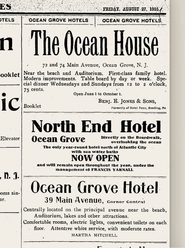 History/mystery 2021: Recently Ocean Grover Lee Morgan found a page from the Ocean Grove Times dated August 27, 1915. It contains an interesting ad for the Ocean Grove Hotel. That hotel was not mentioned in the 1939 hotel list, but you can see that the address is #39 Main Avenue.